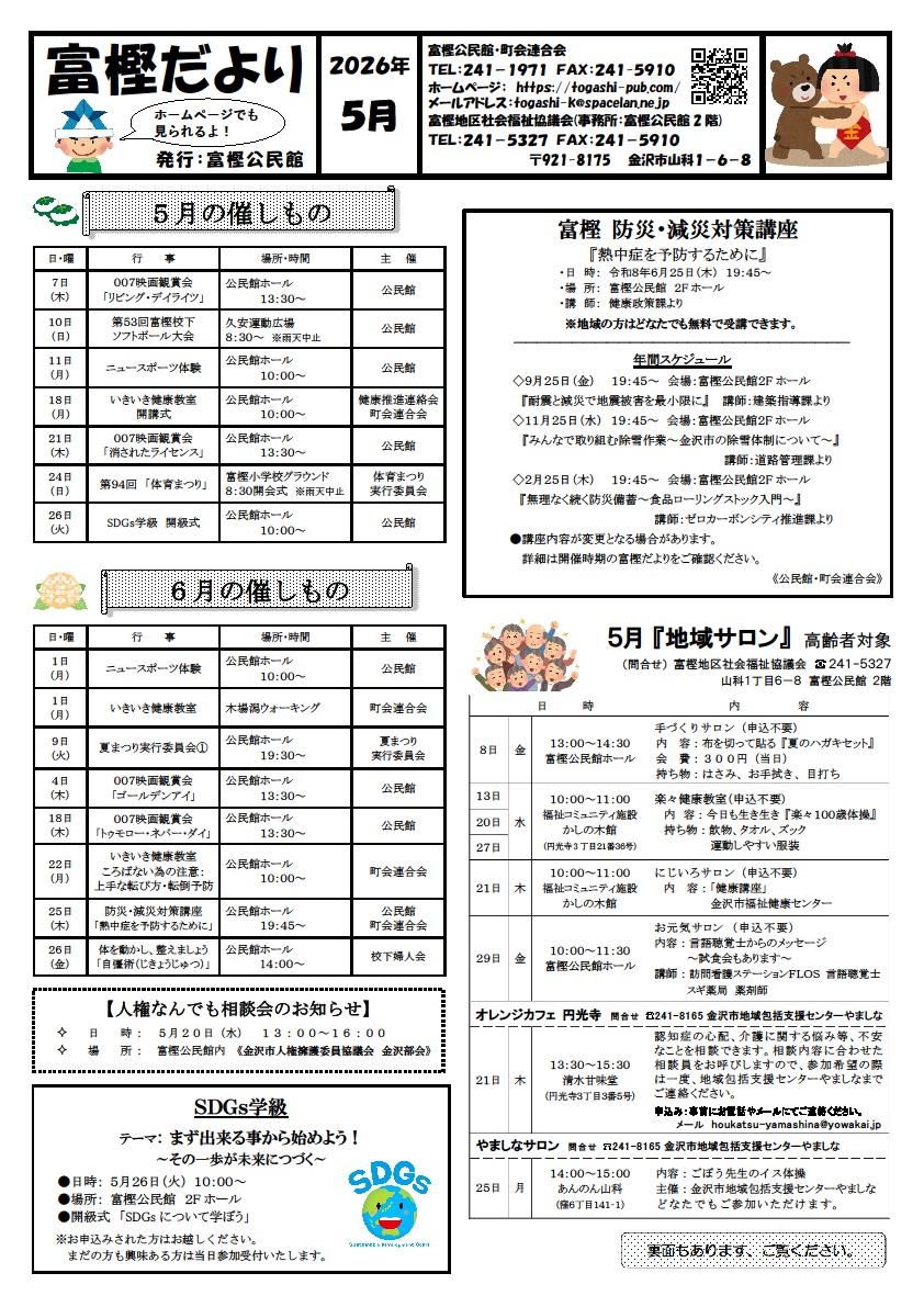 2026年4月28日 / 最終更新日 : 2026年4月28日 富樫公民館 富 樫 だ よ り 富樫だより5月号 発行 富樫だより5月号(PDF版) 総閲覧数: 6 , 今日: 6 Facebooktwitter